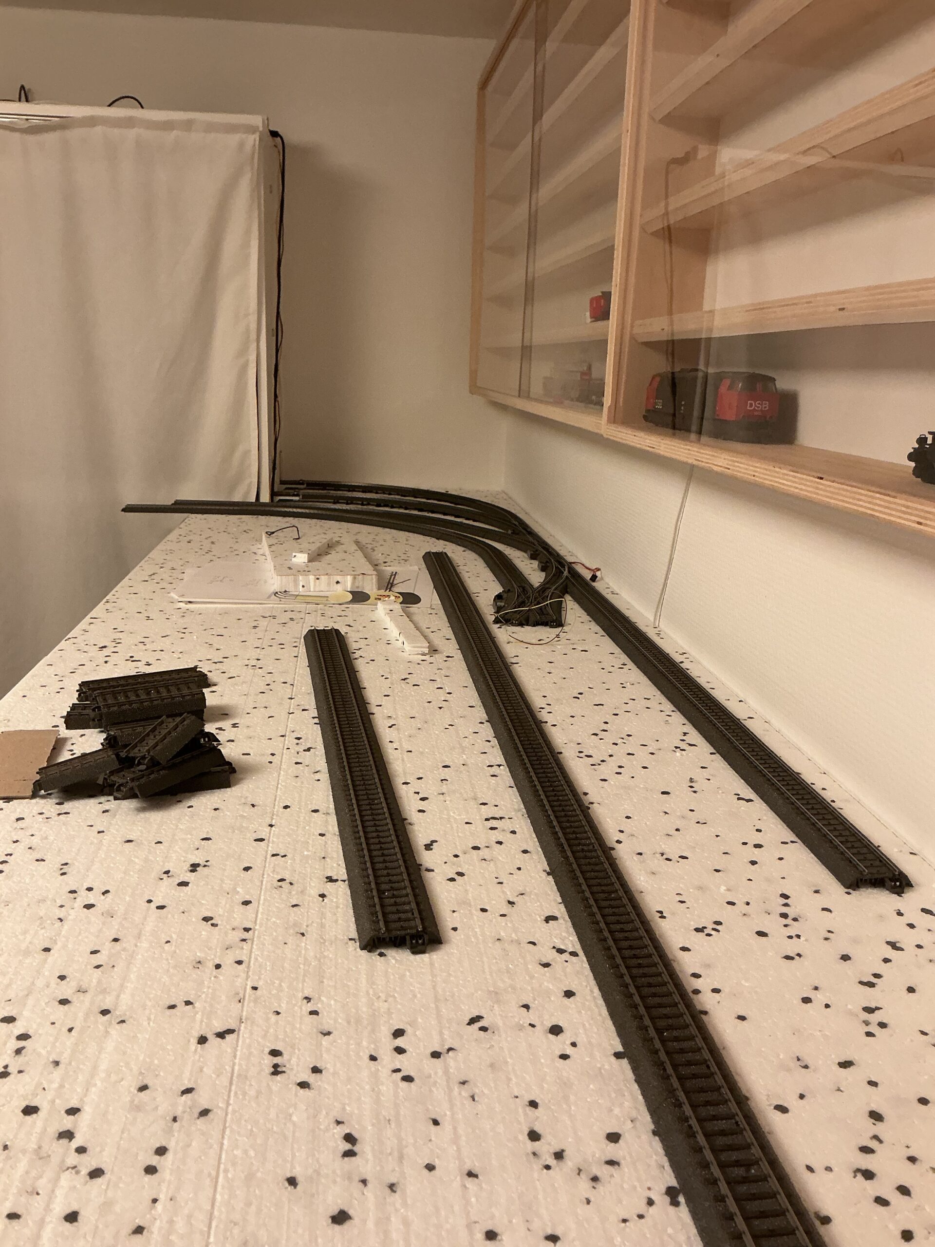 Så jeg begynder nok henne i terrasse-enden og bruger de skinner, jeg allerede har, hvilket omfatter to sporskiftere. Så jeg vil kunne lave to spor på terrasse-endestationen og en vendesløjfe. Men umiddelbart ikke vigesporet i midten og vendesporet. Og langt fra hele længden af banen. Det må komme efterhånden som jeg finder materiellet på brugtmarkedet eller efterhånden som jeg får sparet sammen.