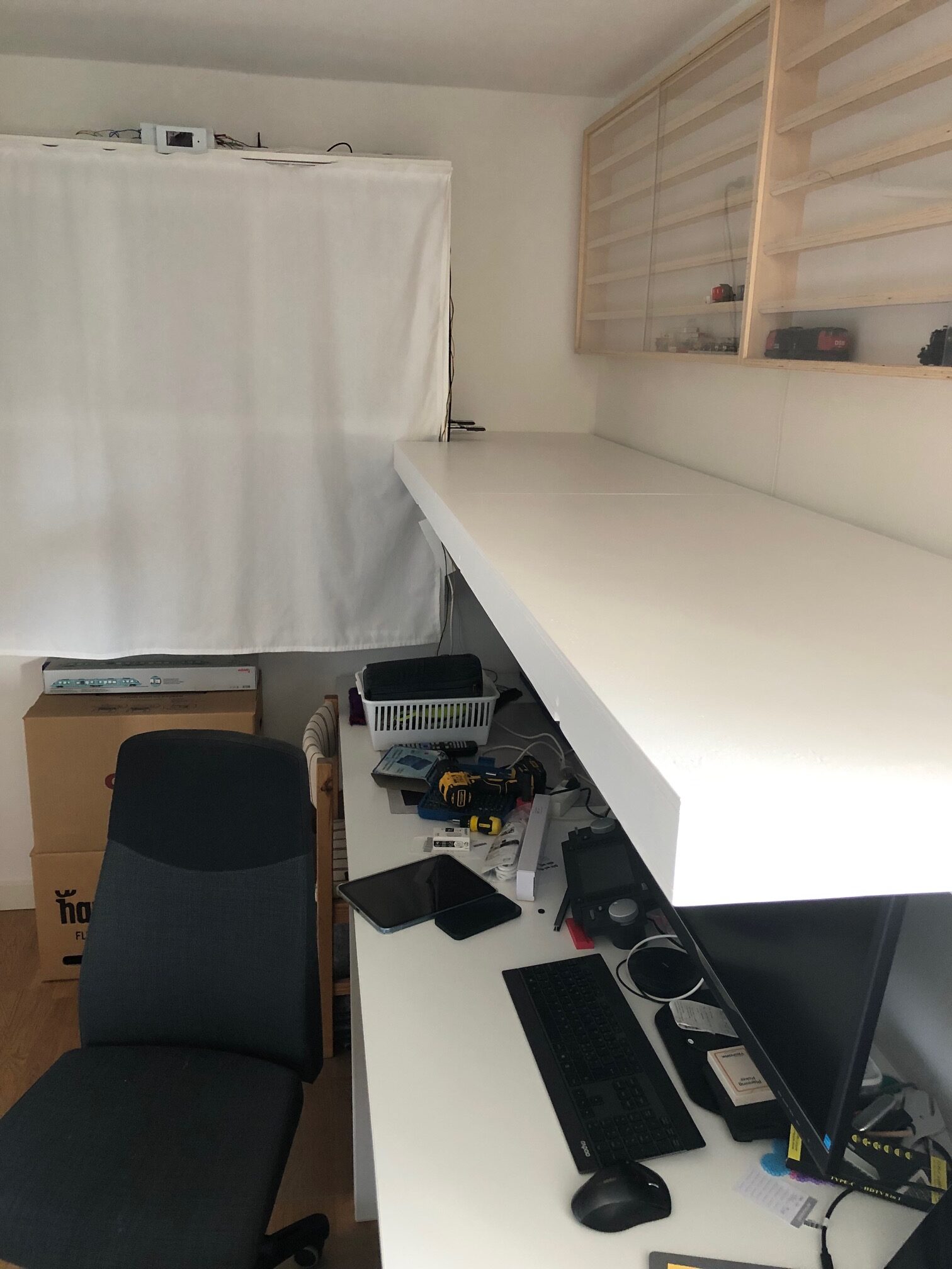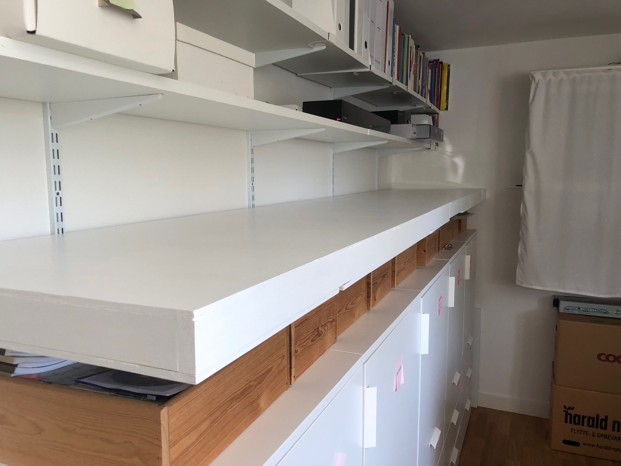 Så jeg har ryddet op i både garagen og tog-rummet. Dvs. lagt alt værktøj på plads og flyttet mit arbejdsbord på plads, så det ikke længere står inde under elevatoren. Der står i stedet to flyttekasser med ting og sager til at bygge banen af. De havde ellers haft ophold i entreen, siden elevatoren kom ind fra malerværkstedet.