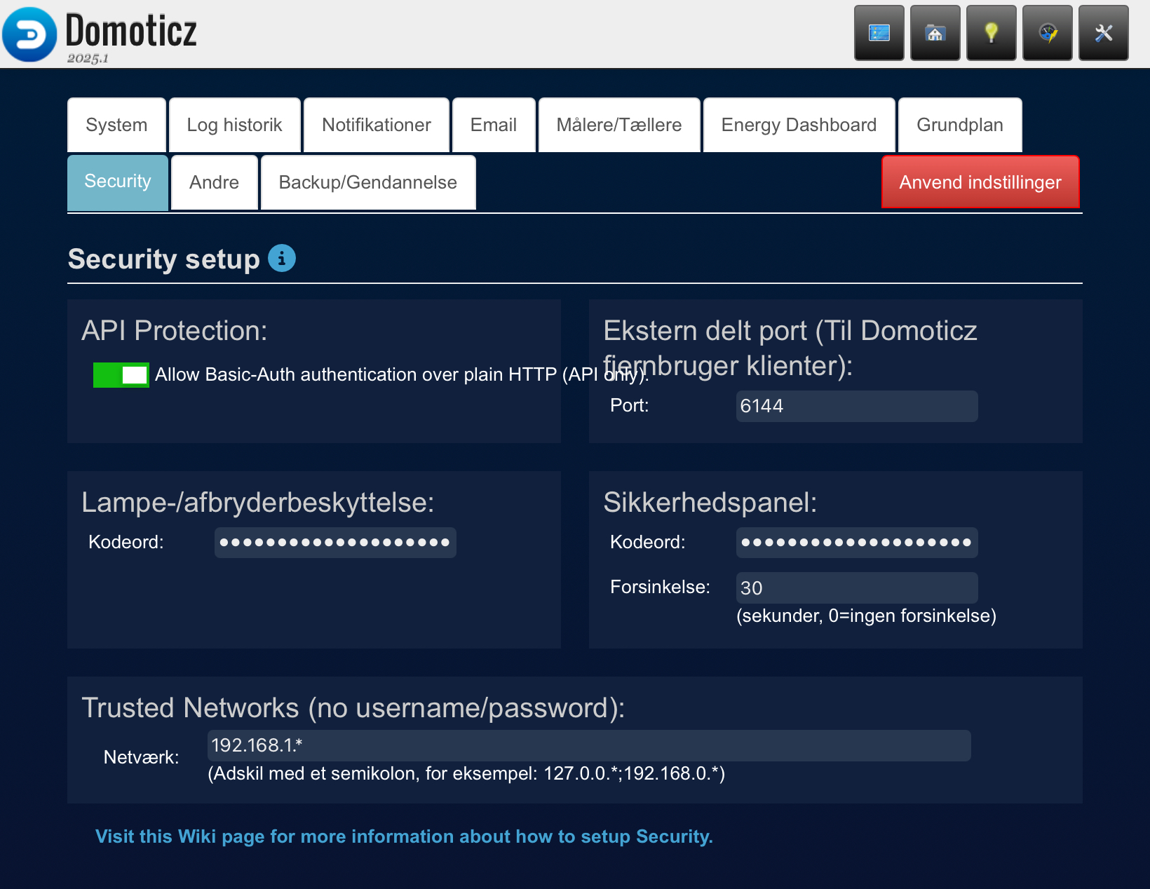 Derfor måtte jeg videre med at få Domoticz og HomeBridge til at tale sammen. Det krævede bl.a. en opdatering af Domoticz. Og det var selvfølgelig nemt (sarkasme kan forekomme). Blot et tryk på “Update” i WEB UI’et. Opdateringen gik fint. Det tog kun få sekunder. Problemet var bare, at Domoticz ikke længere kunne starte. Der manglede en nyere version af et SSL library. Og også her var Raspbian fra 2019, og kunne ikke længere opdateres. Så på den igen. Jeg lavede en backup af domoticz folderen til harddisken i garagen og installerede en frisk Raspian og en frisk Domoticz på et andet SD kort. Dernæst kopierede jeg nogen plugins fra backup’en og installerede en enkelt fra GitHub. Derved fik jeg forbindelse til IHC, Zigbee2MQTT og Shelly dimmeren ved halvmuren i køkkenet. Og efter en restore af databasen direkte fra databasefilen i backup’en i garagen var Domoticz stort set sig selv. Den manglede kun at vise fanebladet med grundplanen af huset og alle de scripts, der automatiserer sensorer og andre ting og sager. Jeg fandt ud af, at fanebladet kunne enables under opsætningen af brugeren. Og da jeg havde gjort det var scripts’ene af en eller anden grund også tilbage igen.